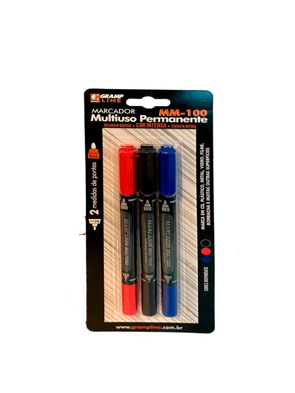 CANETA PERMANENTE 2 PONTAS MM100 BLISTER C/ 3 CORES - GRAMPLINE